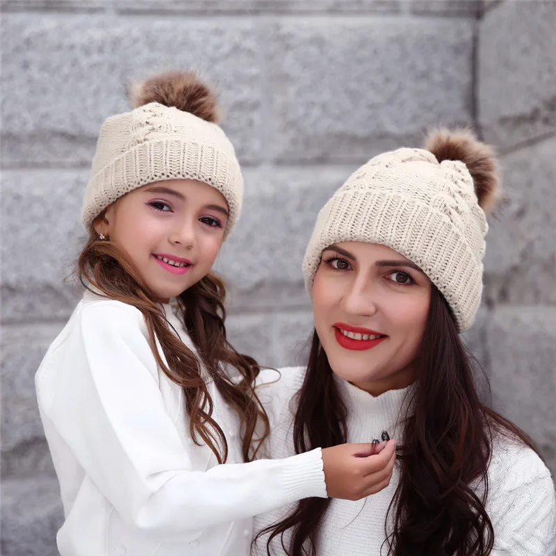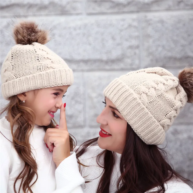 Cheap Chance of 2Pc/Set Winter Family Match Mother Daughter Son Baby Boy Girl Kids Knit Hat Adult Kids Hats women M